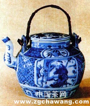 这件青花提梁茶壶,是明万历年间景德镇民窑烧造的。青花色调,蓝中泛紫。画面图案繁密,用笔粗犷,布局繁乱。瓷胎质地较粗,胎体