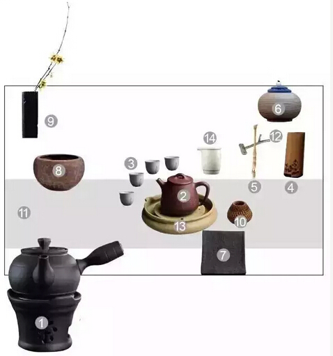 茶品万物,茶席的布置,也让原本安静的茶汤在空间里流动了起来看这张长方形席,以右手泡茶的标准茶席圗,名称分别为:1、煮水器(