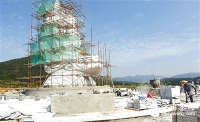 “万里茶道”雕塑前,工人在忙着施工。(邱汝泉 摄)