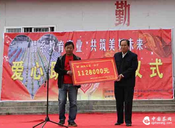中国茶网资讯:10月30日上午,雨林古茶坊·一真雨林百万认购款捐赠仪式在西双版纳勐海县举行。此次捐款总额达1128000元,受捐对象为勐海县第一中学。善款来自雨林周年纪念饼一真雨林认购所得。一真雨林6千克大饼限量发行205套,继送出111套之后,余94套以12000元/套交由雨林全国分销伙伴自愿认购。雨林古茶坊自成立以来,已先后为勐宋三迈小学、南本老寨村寨公路、布朗山帕亮小学、巴卡囡小学捐资300余万元。