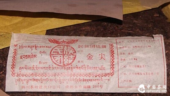 生产时间最早,并具有一定数量和商品流通价值的,应该是内飞标注为“中国茶叶土产进出口公司”的60年代代牛皮包金尖了(俗称“老白票”)。60年代牛皮包金尖,除了少量是荣经茶厂或天全茶厂生产外,90%以上是雅安茶厂生产(雅安茶厂、荣经茶厂、天全茶厂均于1958年建厂)。70/80年代金尖,中茶公司旗下茶厂主要有雅安茶厂、天全茶厂、名山茶厂(俗称“黄票”),经确认属于80年代后期生产的牛皮金尖,还有几个地方国营茶厂,主要有雅安市茶厂、邛崃茶厂、永福茶厂、名山供销社、幸福茶厂,主要生产时间是87年、88年,80年代,还有两个民营企业:笔山茶厂、和龙茶厂,83年建厂,但笔山茶厂、和龙茶厂生产的金尖能确认年份的一般是90年代早期,因此也只好把这两个厂的牛皮包金尖认定为90年代早期了,90年代早期的牛皮包金尖还有雅安市茶厂、青衣江茶厂、兄弟友谊茶厂,但留存量都不多。90年代后期的茶厂就很多了,大部分是新成立的民营茶厂。
