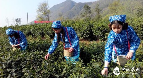 上午九时许,装扮整齐的采茶女一边唱起山歌,一边开始采摘清明节前的春茶。