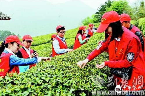 图为:4月1日,恩施市组织青年志愿者到该市屯堡乡帮助茶农采摘明前茶,以解燃眉之急。 (视界网 谢顺 摄)