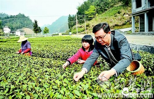 图为:心忧茶园,恩施州委书记王海涛来到宣恩县椒园镇庆阳坝村,帮茶农一把。 (视界网 李以国 摄)