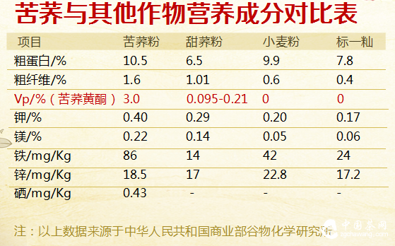 从这份来自中华人民共和国商业部谷物化学研究所的苦荞与其他作物营养成分对比表可以看出,其他作物营养成分里不具备苦荞黄酮或者极少的含量。