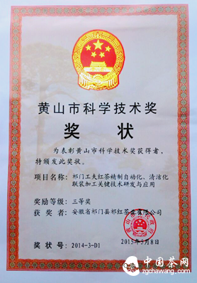 近日,黄山市人民政府公布了2013--2014年度的黄山市科学技术奖获奖名单,祥源茶业祁红公司报送的祁门工夫红茶精制自动化、清洁化联装加工关键技术研发与应用获评三等奖。