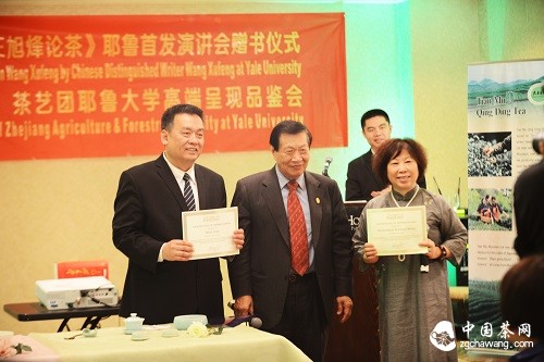 5月29日晚,中国著名作家、著名茶文化学者、浙江农林大学文化学院院长王旭烽教授在美国耶鲁·纽黑文饭店举行《爱茶者说》英文版首发演讲暨赠书仪式。纽黑文市文化部长,耶鲁大学负责亚洲事务最高官员王芳和40多位大学教授,80多位各界华人菁英及数十名学生出席了首发演了讲会和赠书仪式。