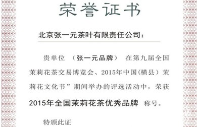 在花香四溢的美好时节,由中国茶叶流通协会与横县人民政府共同举办的第九届全国茉莉花茶交易博览会、2015年中国(横县)茉莉花文化节隆重开幕,百年老字号张一元荣获“2015年全国茉莉花茶优秀品牌”称号。同时,王秀兰女士荣获“2015年全国茉莉花茶制茶工艺传承杰出人物”称号。