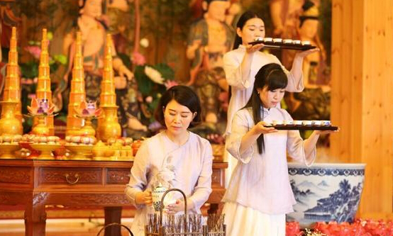 祈福、静心、禅定、诵心经、品朝茶、静听琴、坐蒲参人生……5月21日,在郑州大观音寺七佛殿,一场由大观音寺禅茶学会精心复原打造的“观音茶宴”系列之朝茶会如期举行。点茶师身着素服,焚香、置炭、燃炉、煮水、点茶、分盏、敬茶,众茶童亦着传统素服、以禅茶礼仪为宾客奉茶,为大家复原展示了观音茶礼。现场,数十名茶会宾客恍若穿越,闻香品茗,以礼敬谢,在感受中华传统文化精髓的同时,品悟了禅茶文化的深厚内蕴。图为点茶师现场将茶水分盏,以禅茶礼仪为宾客奉茶。 周小云 摄