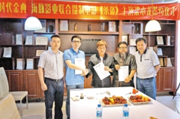 当天下午,时代金典董事长沈春航先生和海豚影业董事长周华雄先生与香港著名影星梁小龙先生在编剧导演潘富荣、第一设计网董事长姚世杰、副总贺平、海豚影业副总付大兵、著名影星陈市、星时空广告董事长袁雪平、时代金典副总阎晨等共同见证下签署合约,这标志着电影《茶盗》正式启动。