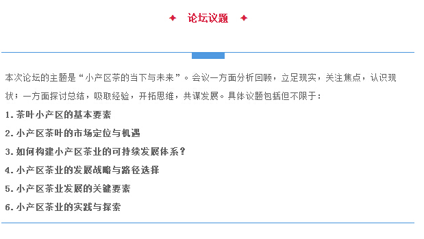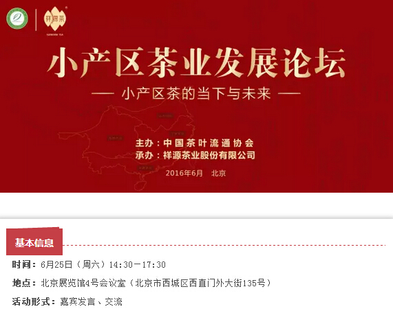 由中国茶叶流通协会主办,祥源茶业股份有限公司承办的“小产区茶业发展论坛——小产区茶的当下与未来”将邀请知名专家、学者、产区代表与企业代表,研讨茶叶小产区的关键要素,探讨小产区茶业的市场机遇、发展战略、路径选择、品牌塑造,在分享经验与交流体会的基础上更进一步形成共识,推动发展。