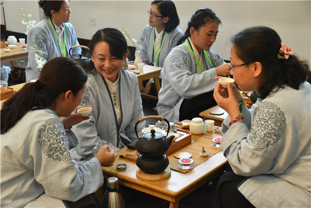 无我茶会是一种“大家参与”的茶会,人人平等,无求回报之心。参加茶会的每个人泡的茶都是奉给左边的茶侣,自己所品之茶却来自右边茶侣。通过无我茶会,学员们进一步学习体会到人人都为他人服务,而不求对方回报。