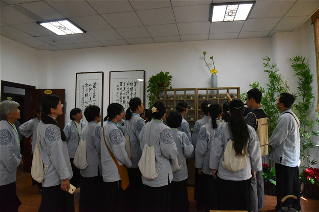 欣赏字画如同品茶,寺院巡礼的其中一站是正觉寺书画院。出自书画大家、德高望重的尊者之手的作品,力透纸背,学员们或感受跃出纸面的力量,或享受到自在安然的禅境,或体悟到字里行间的慈悲……艺术是相通的,也是相互交融的,书画院的艺术氛围,让学员们驻足体悟。