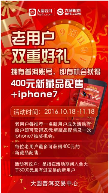iphone7!新藏品!……10月18日至11月18日,大圆普洱狂欢活动正式开启,针对面对新老客户放出丰厚的福利。在整个这一个月时间里,只要参与活动就有机会获得各种丰厚的奖励。