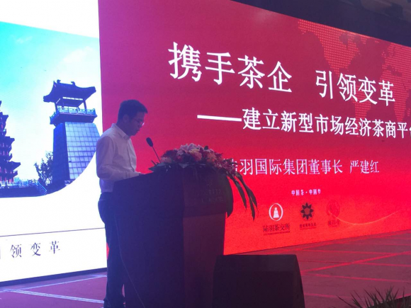 图二:陆羽国际集团董事长严建红发表了《携手茶企、引领变革----建设新型市场经济茶商平台》的演讲