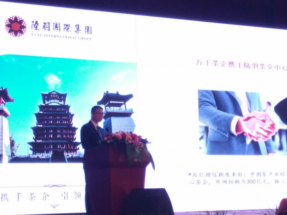 陆羽国际集团董事长严建红发表了《携手茶企、引领变革----建设新型市场经济茶商平台》的演讲。严建红先生介绍:陆羽国际集团源自茶圣故里湖北天门,是国内历史悠久、行业领先的茶文化集团,业务覆盖全国核心城市和主要产茶区。集团业务包括茶文化板块“陆羽会”(含茶经楼、茶频道、茶学院),金融板块“陆羽金服”(含茶交所、茶基金、文化金融),是国务院参事室国茶基金会执行单位、文化部特色文化企业、农业国际合作协会农业标准化、产业化、国际化示范单位,打造国际一流的茶文化产业及文化金融集团。集团在天门兴建了中国茶文化和茶标准的坐标——陆羽茶经楼,在武汉成立了中国首个省级茶交易平台——陆羽茶交中心、在深圳发行了中国首支茶基金——陆羽基金、在上海建立起首个茶文化金融推广团队——陆羽金服。今年陆羽国际集团的文化主题是:信任,从一杯茶开始。陆羽国际集团愿与中国6亿茶人共同见证和参与中国茶文化创新、复兴之路。