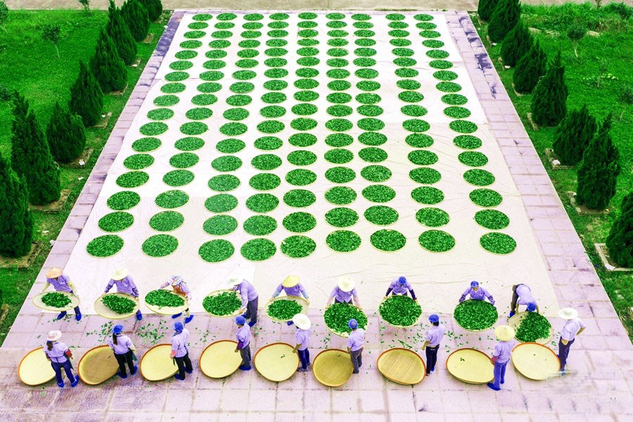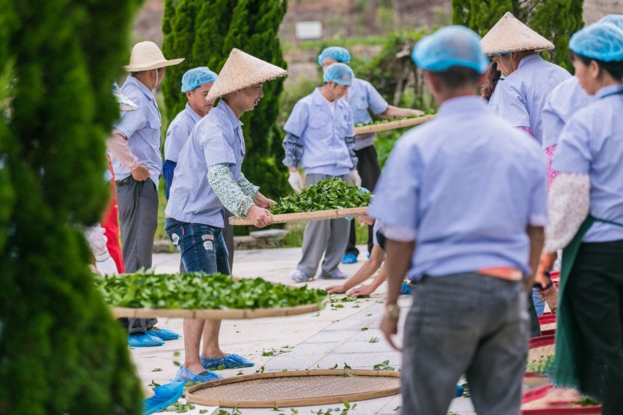 铁观音制作严谨,技艺精巧,比一般品种要求严格而精细,其工序:鲜叶→晾青→晒青→做青→炒青→初揉→初烘→复揉→烘干。图为茶园的工人正在晾青。