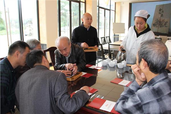 品鉴会开始,茶艺师准备茶具,取茶样,几位专家查看干茶的外形并作出评审。