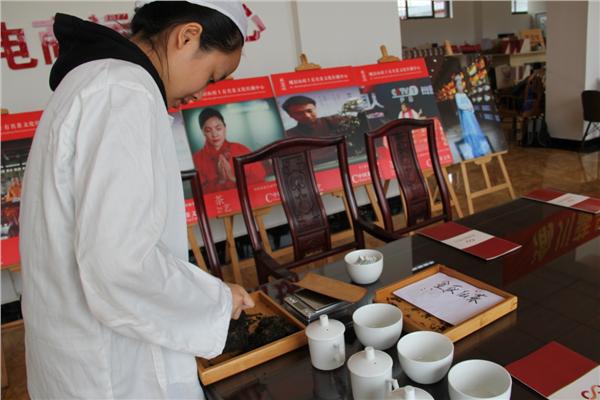 茶艺师取3g金茯仙茶进行冲泡,出汤后由专家评审茶汤汤色。