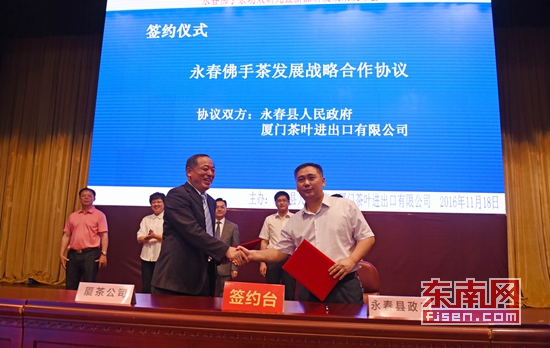 东南网11月18日讯(本网记者 潘贤利 陈诗婷 刘棋和)永春将进一步打响佛手茶品牌,做大做强茶产业。11月18日,永春县召开永春佛手茶功效研究暨新品研发成果发布会,国家植物功能成分利用工程技术研究中心主任、湖南农业大学教授刘仲华发布了佛手茶健康功效等研究成果;发布会上还举行了2016年茶王赛颁奖仪式;厦门茶叶进出口有限公司与永春县签订永春佛手茶发展战略合作协议书,该公司还分别与魁斗莉芳茶厂、蓬壶茶厂签订共建基地及采购协议书。