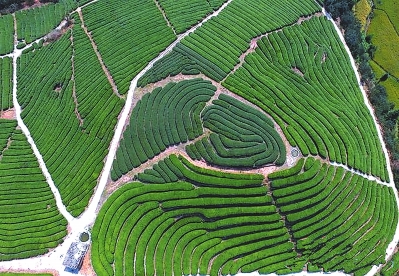 图为近日,在宁化中沙乡航拍的有机茶园。