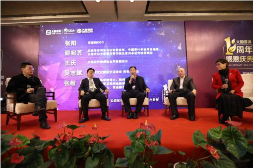 在接下来的圆桌论坛环节中,茶语网CEO张阳担任主持人,中国茶叶流通协会常务副会长王庆、云南省普洱茶业协会副会长、中国茶叶学会茶叶感官审评与检验专业委员会副主任邵宛芳、中国茶文化国际交流协会 常务副会长吴志斌和南京审计大学金融学院院长张维就中国茶特别是普洱茶的国际化、文化推广以及茶金融等进行了深入探讨,并充分肯定了大院普洱开创了茶金融元年。与会专家认为,在此前茶行业面临产能过剩、品质化缺失等局面时,大圆普洱的出现给整个行业良性发展提供了一条创新的路径,并对普洱茶标准化相关工作的促进有着极大的推动作用。