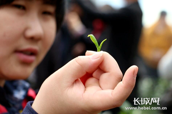 工作人员介绍采摘好茶的标准——一芽一叶。长城网 高琳哲 摄