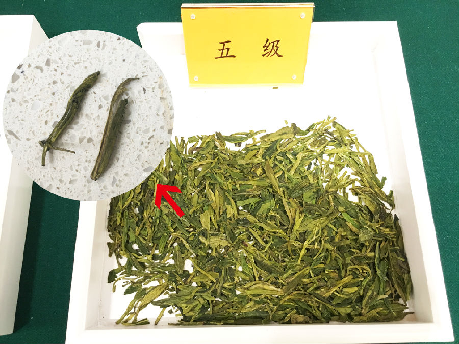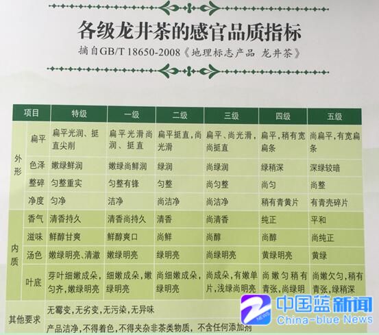 “首先,是要在西湖、钱塘、越州的龙井茶产区产出的绿茶,才是龙井茶。茶叶在没有泡开的情况下,绿且润是品质好的关键。另外是原料的细嫩程度,特级龙井茶外形来看扁平光滑、挺直尖削,颜色是嫩绿油润而且匀称的。品级往下呢,就稍微差一些,原料没那么细嫩了,到了五级颜色就是深绿原料也比较老了。”