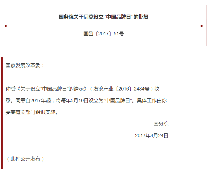 日前,国务院印发《关于同意设立“中国品牌日”的批复》,同意自2017年起,将每年5月10日设立为“中国品牌日”。