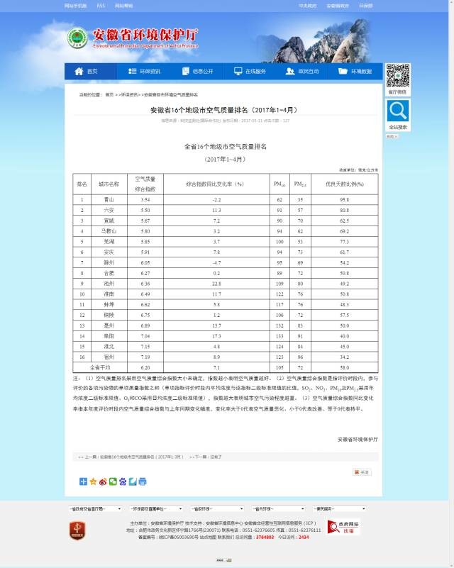 安徽省环境保护厅近日发布安徽省前四个月16个地级市空气质量排名,黄山、六安、宣城以3.54、5.50、5.67的空气质量综合指数分列前三。
