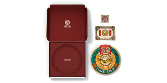 一饼熟普,用中国传统手绘纹样描绘在白棉纸上,根据茶品等级分为 “宫廷系列”“金芽系列”“经典系列”,不同等级搭配不同配色,宫廷绛紫,金芽海绿,经典赭石三色主色,搭配赭黄,靛青三色配色,恰如一张国画重彩,厚中生津,染不露痕,深浅自然。