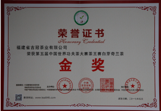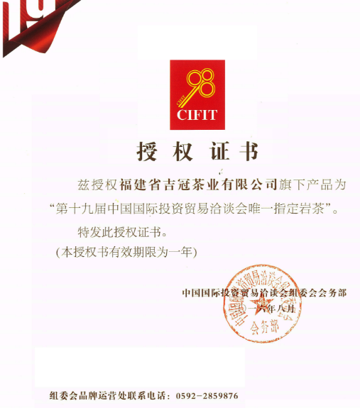 吉冠茶业是“第19届中国国际投资贸易洽谈会唯一指定岩茶”,为来自海内外的贵宾提供纯正的武夷岩茶服务。同时荣获“第五届中国世界功夫茶大赛茶王赛白芽奇兰茶金奖”称号,而且吉冠还是漳州片仔癀指定唯一的“白芽奇兰茶”品牌合作生产商,产品在片仔癀全国的体验馆内均有销售,其育茶、制茶工艺已经非常成熟,引领行业先锋。