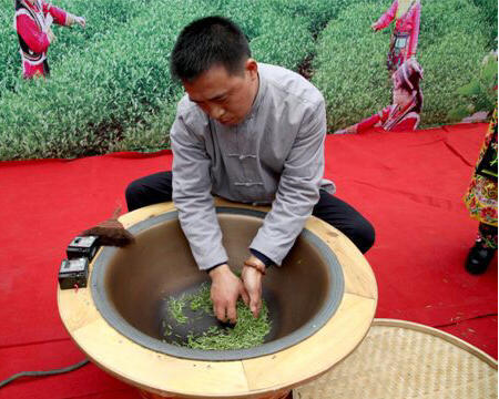 现场,杨俊成娴熟地将提前准备好的川茶鲜叶倒入了加热后的茶锅中,顿时,翠绿色的嫩茶鲜叶开始在茶锅里跳动。杨俊成一边用双手均匀的翻炒,一边现场为嘉宾们讲解:“开始下锅的时候,以焖为主,当感到叶子烫手并蒸发大量水分时,翻炒得加快,以抛为主。要抛得高,撒得开,捞得净,使茶叶均匀受热,水分快速蒸发,这样才能避免焦边红叶。”现场的嘉宾们聚精会神地凝视着杨俊成的一系列动作,当叶质柔软的鲜茶在他手中逐渐变暗的时候,一阵阵清香扑鼻而来,直到慢慢地变得清香四溢,现场的嘉宾们纷纷用手机、相机记录下这难得一见的场面。