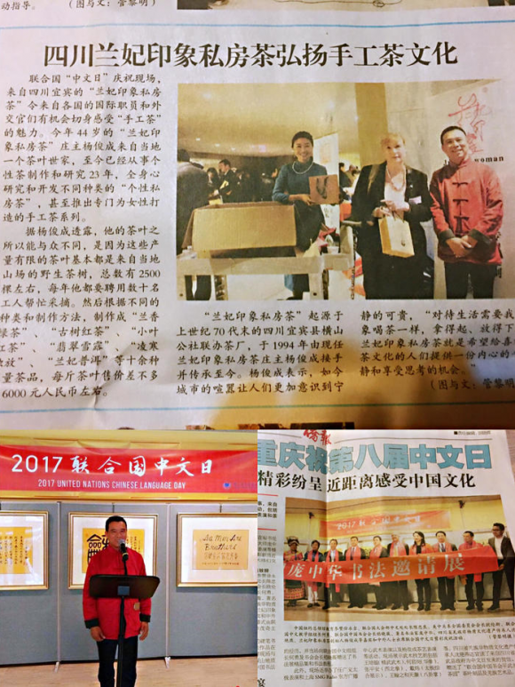 精彩的表演、幽幽的茶香,杨俊成精湛深厚的茶技功底和巧妙娴熟的炒茶手法,像一股和煦春风,征服了数百名联合国的官员、各国外交官以及各界到场的来宾,掌声雷动,阵阵赞叹!经过联合国中文日所有的官员、各国外交官以及大众评审专家们的一致决定,再次授予第二次受邀参加联合国中文日(UN Chinese Language Day)的川茶品牌“兰妃印象私房茶”成为“联合国中文日”唯一指定茶礼,使其成为了最受欢迎和关注的中国传统文化产品!