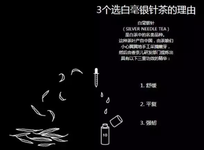 白毫银针(Baekho Silver Needle),是白茶中最珍罕名贵的品种。产品研究部门以中国福鼎地区嫩叶芽顶为原料,遵循传统古法制作,通过纯手工采摘,耗时十天,纯天然日晒后,从中萃取富含茶氨酸和多元酚活性成分。配方的核心成分,在香奈儿的描述中,白毫银针被认为具有三重功效——舒缓、镇定、坚韧。