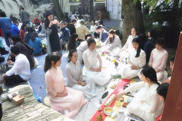 临江望水,席地而坐,于袅袅茶烟中闻香、赏花、谈天说地,一曲《流水》、一支禅舞,更平添几分意境。相识的、不相识的一群人因茶而聚,举杯共饮的神色里,仿佛久别重逢的故人,多么奇妙的感觉。