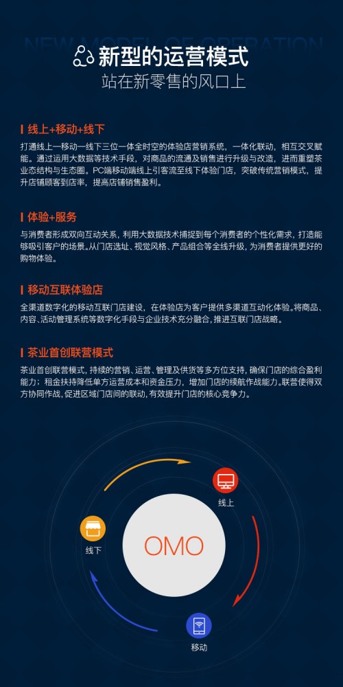 醉品茶集打通“线上-移动-线下”三位一体全时空的体验店营销系统,一体化联动,相互交叉赋能。通过运用大数据等技术手段,对商品的流通及销售进行升级与改造,进而重塑茶业态结构与生态圈。PC端、移动端线上引客流至线下体验门店,突破传统营销模式,提升店铺顾客到店率,提高店铺销售盈利。