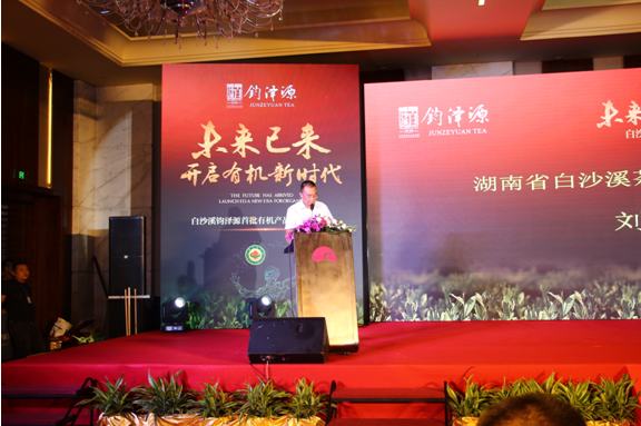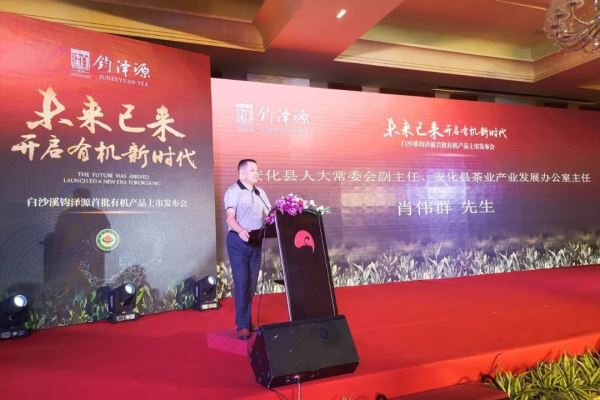 湖南省白沙溪茶厂股份有限公司总经理刘新安首先致辞。刘总谈到,“钧泽源有机茶产品还有由天时地利带来的特殊的人文故事,象征着白沙溪百年根基万世传承的茶人精神,饱含着入士晋相、加官晋爵、门庭显赫之意蕴,当您品着这杯中茶时,必是家风、国威、父孝、子贤皆兼具于茶品,瞬间精神为之一振,其贡献担当之力倍增,其茶亦带着灵气带着吉祥而更为珍贵。”