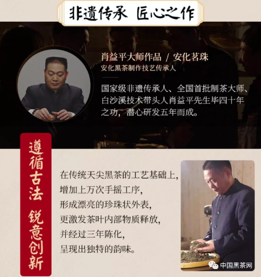 安化茗珠是白沙溪2018年度最重要的创新产品之一,该产品由国家级非遗传承人、全国首批制茶大师、黑茶国家标准专家、白沙溪技术带头人肖益平潜心数年研发而成,并经过五年陈化,两年精心策划运作,称得上是真正的“匠心之作”。