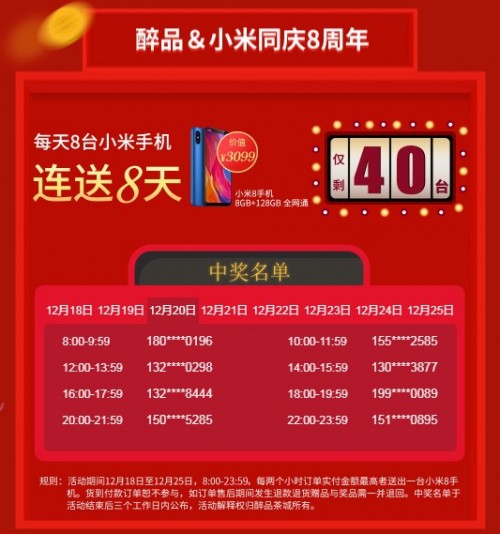 醉品集团深受雷军青睐,早在2015年1月,就获得小米科技董事长雷军领衔的国际知名投资机构顺为资本的千万美金A轮投资。此次正值醉品集团八周年,醉品联合小米赠送100台价值为3099元小米8手机回馈广大醉品茶友。截止目前已经赠送了60台,剩余40台将继续在醉品茶城平台内赠送给每两小时订单金额最高的消费者。