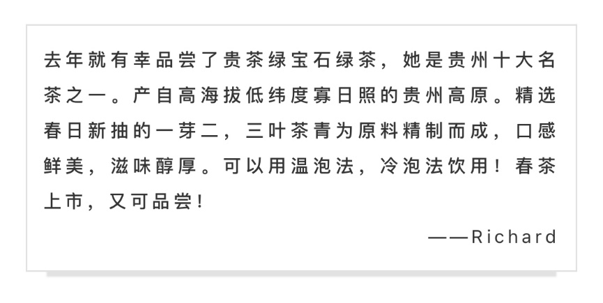 春到黔山,贵茶飘香。作为贵州茶“三绿一红”代表品牌之一,贵茶绿宝石高原绿茶为出口欧盟的品牌,其茶形美似珍珠、茶色纯如宝石,栗香浓郁,入口鲜爽醇甜,饱满醇厚,口感可媲美芽茶。