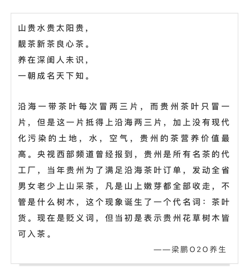 最近中国国家地理官微文章《南方有嘉木 何地出好茶》,里面就有不少关于贵州茶和高原绿茶的描述,得到粉丝的热烈响应。