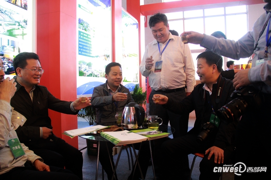 陕西省茶企业在陕西馆内摆起了“茶座”邀请客商前来品茶论道,受到了客商热捧。