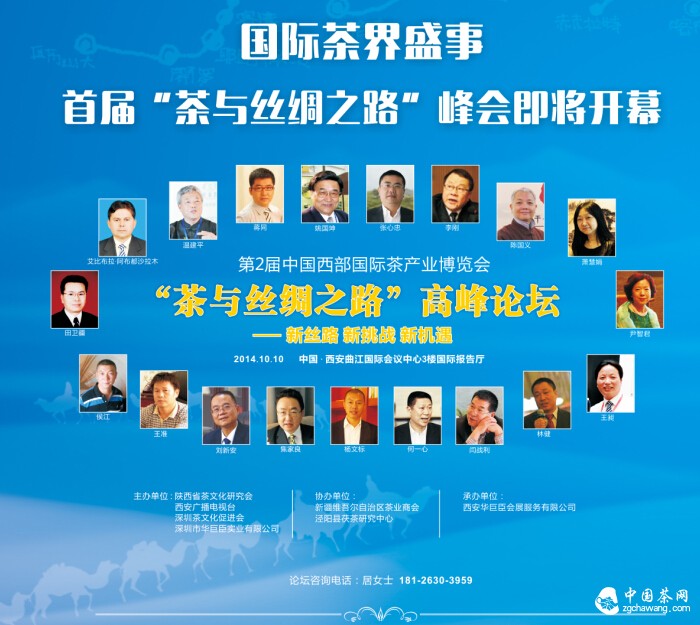 2014年度“茶与丝绸之路高峰论坛”是由陕西省茶文化研究会、西安广播电视台、深圳市茶产业促进会、深圳市华巨臣实业有限公司共同主办的茶行业高峰论坛,主办方将以全新的模式,力邀国内知名茶叶企业、文化学者、经济学家、媒体嘉宾等云集参加,论坛特别特邀中国国际茶文化研究会常务副秘书长、浙江农业大学教授姚国坤,著名品牌管理专家、资深战略营销专家、上海交大张心忠教授、和君咨询集团战略营销和产业整合专家蒋同先生,西北大学哲学与社会学学院、经济管理学院教授李刚教授、新疆维吾尔自治区党校副校长艾比布拉·阿布都沙拉木、香港凤凰卫视时事观察员、亚洲卫视军事评论员温建平先生以及邀请来自新疆、香港、韩国、马来西亚等茶行业名人参会,以“新丝路、新挑战、新机遇--中国茶企经贸与发展”为议题,就新丝绸之路经济带战略环境下的中国茶文化、茶产业发展现状、茶贸经济环境、未来发展思路展开深度分析。同时,现场邀请六大茶类的茶业领袖--焦家良、何一心、刘新安、林建、王准、王昶、闫战利以及老舍茶馆掌门人尹智君等齐聚古都西安,进行现场与专家对话和互动,就茶企关心的话题展开深度探讨,论坛鼓励参会人员带着各自的观点而来,各抒己见,共同发展中国茶国际品牌的未来方向。