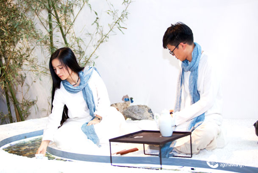 曲水流觞是华巨臣茶博会借用古代文人聚会的形式打造的一个以自然为背景的主题茶会区。古代文人聚会,大家坐在河溪两旁,在上流放置酒杯,酒杯顺流而下,停在谁面前,谁就取杯饮酒,这一聚会形式因王羲之的兰亭序被广泛流传至今。