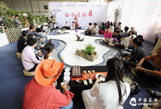 而坐落在会展中心8号馆的“曲水流觞”品鉴区,则是东方美学茶空间的再现,有丝竹兰亭之景,有回环小溪之趣,有盘旋笔墨之韵,有清茗醉人的香,还有曲水取杯品饮的情怀。置身其中,如同穿越回古时的曲水河畔,美不胜收。4天展会,共安排了10场主题茶会,场场爆满。但吸引的,远不止体验者,路过的茶友,没有不特意驻足观看和拍照留影的。同样吸引茶友的,还有8号馆的茶席设计展示。