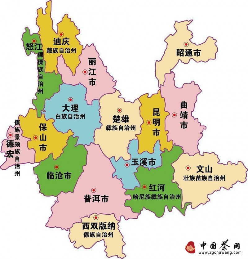 目前在云南省,普洱茶主要有四大产区,从北到南分别为保山市,临沧市,普洱市(原思茅市)和西双版纳自治州,平均海拔从高到低。