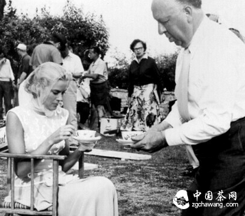 以臭脾气闻名的大导演希区柯克,却对女演员格蕾丝凯利关怀备至。在某拍摄片场,记者抓拍下了他俩喝下午茶的场景——希区柯克温柔又小心翼翼的端给格蕾丝一杯茶。