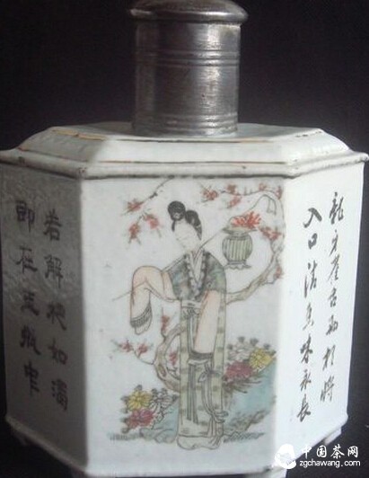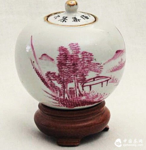 下图胭脂茶罐,白底紫嫣红,彩绘山野扁舟图。构图为远山、树林、茅屋及一叶扁舟。净重约1盎司(28.375公克),故此小巧的茶罐所盛装的茶叶量不大。茶罐造型精美,内置欧美人士向来所喜的香花茶,故推测应是当年外销的高级茶款。