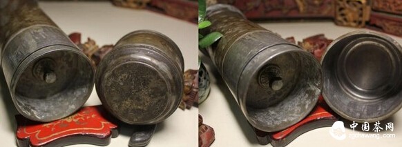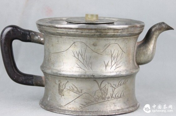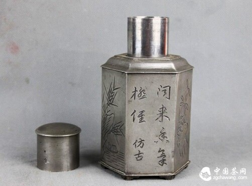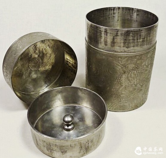 老锡器堑刻松鹤同春筒形茶叶罐。像不像麻匪的烟枪?